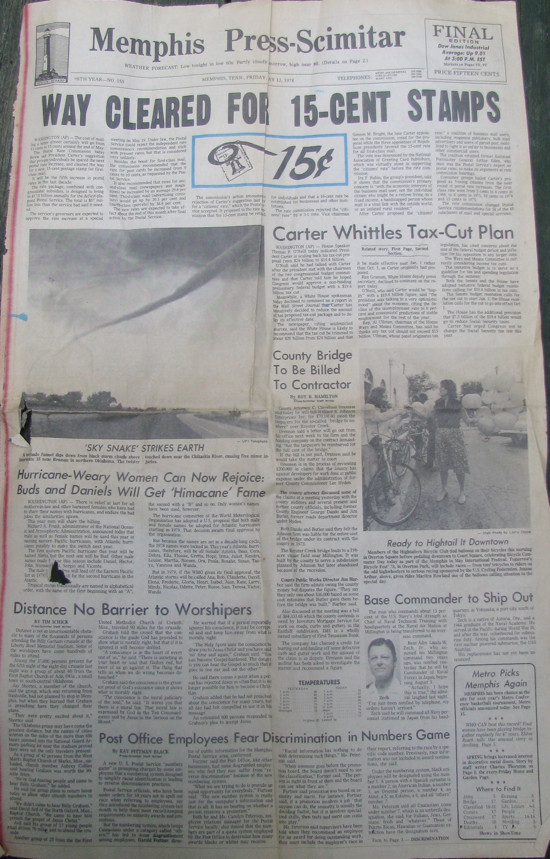 I have been working diligently all summer, tossing stuff, donating stuff, clearing things out, but there still is a lot to do. The other day I found the front page of the Memphis Press-Scimitar from Friday, May 12, 1978.