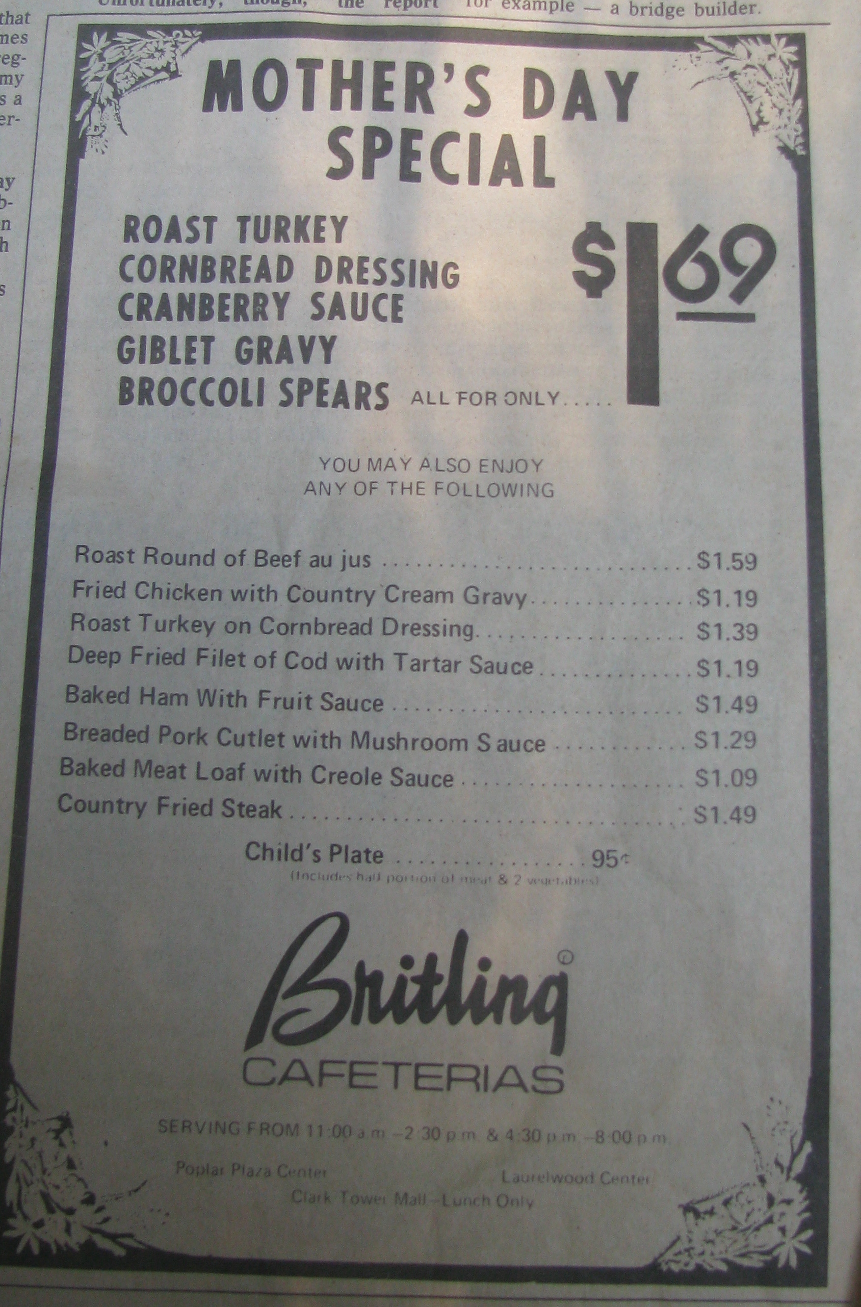 Britling Cafeteria advertised a Mother’s Day Special: Roast turkey, cornbread dressing, cranberry sauce, giblet gravy, and broccoli spears, all for only $1.69. I cannot remember a meal being that inexpensive, even 34 years ago, but I do remember buying a week’s worth of groceries for $16, $4 a grocery bag.